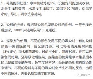 三.助剂常用的有,前处理剂(用于毛坯线的练白和去杂质),媒染剂(明矾,铁媒粉,碱,小苏打,大苏打,石灰粉,豆浆等)有机硅油(用于后处理的柔软)四.染色步骤