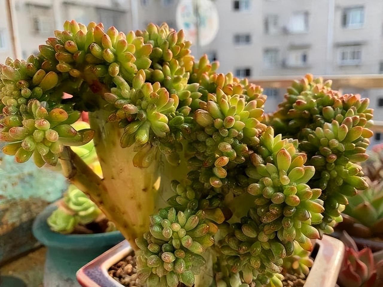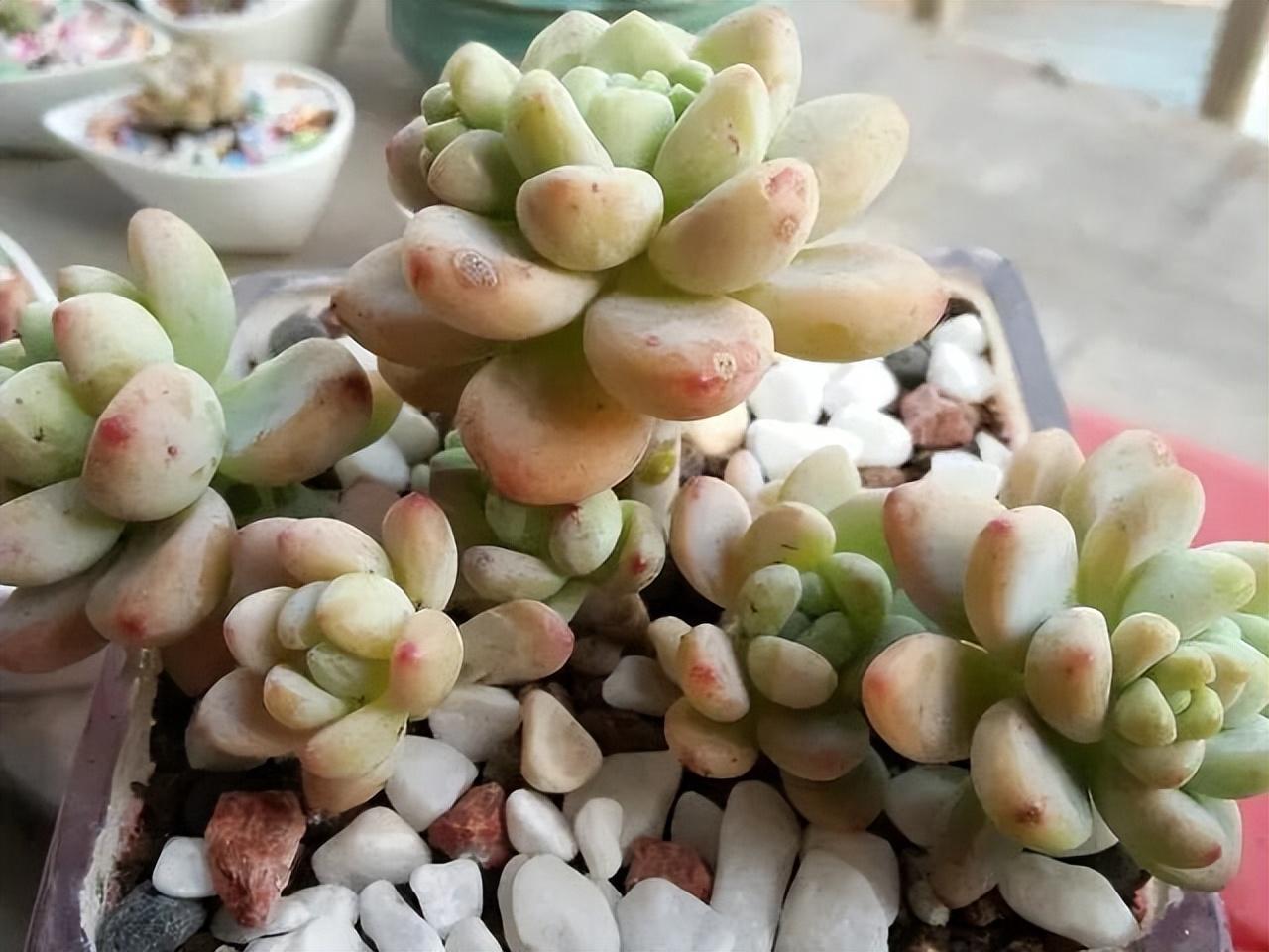 养的时间不长,但凑近了,会有薄薄的香味,生长起来很容易,上色也简单,是一款不错的阳台多肉。养香奈儿,有些地方需要注意,它萌发侧芽的时候,侧芽很像花剑,要注意分辨,别把侧芽给剪掉。
