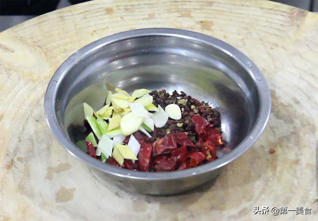 准备一把干辣椒、一小把花椒,切一点葱、姜、蒜备用。
