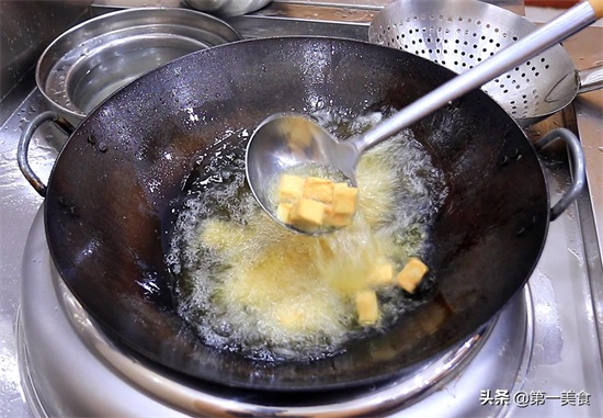 3.把豆腐炸一下:把锅烧热,加入适量的植物油,油温升至5成热时倒入豆腐,开小火炸1分钟左右,豆腐炸成金黄色倒出来控油。
