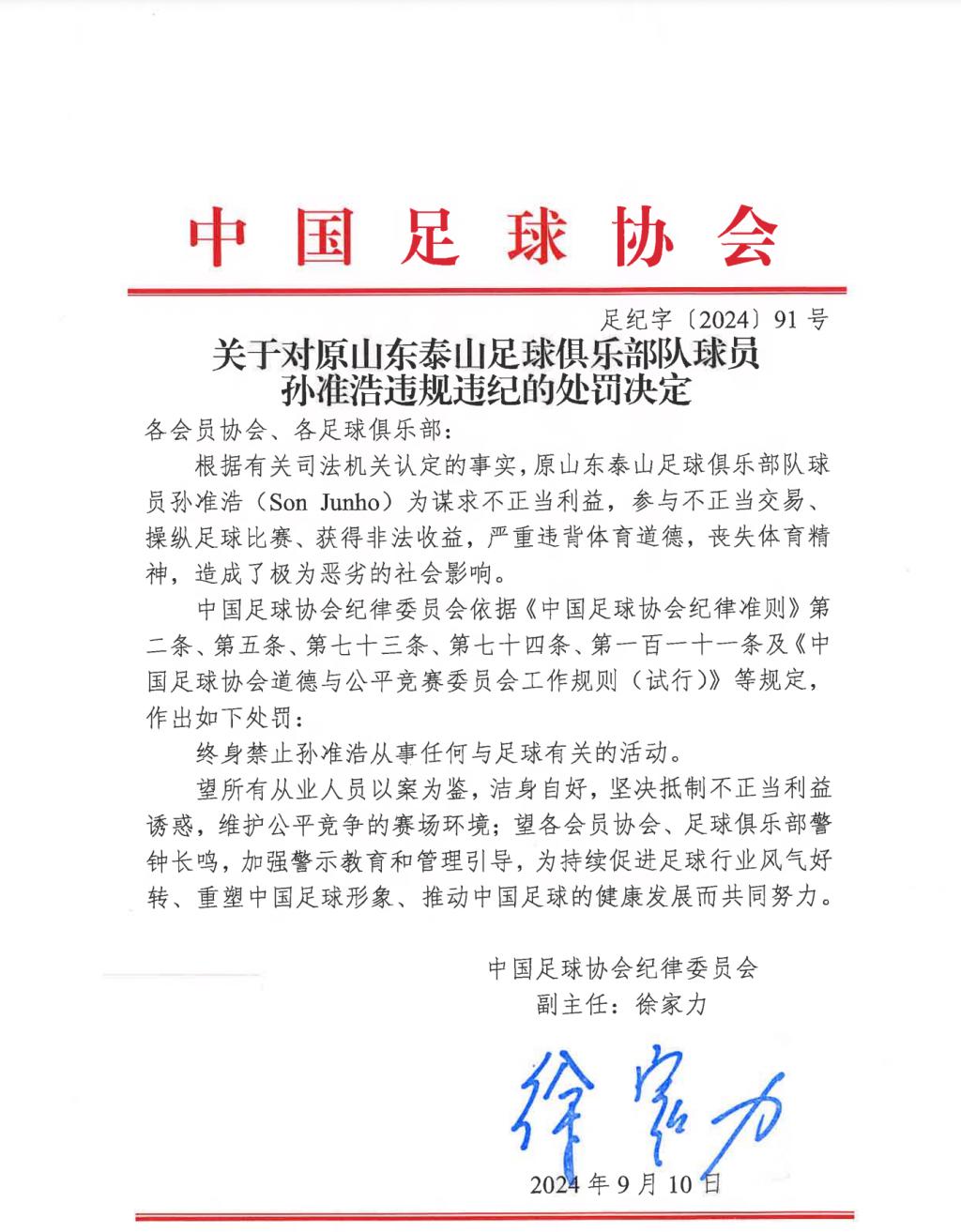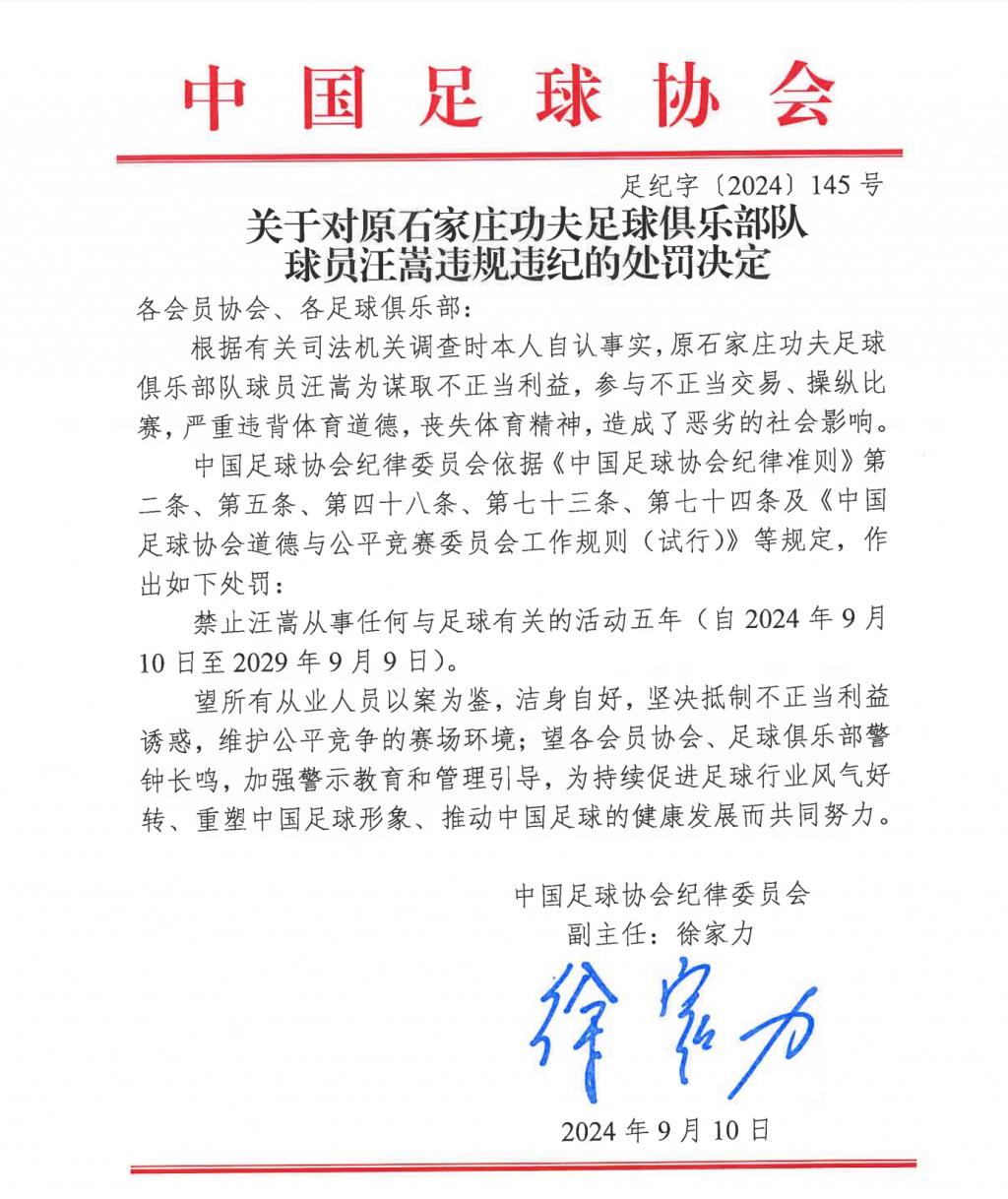 足协官方公布处罚,多达 60 人被罚,其中金敬道、孙准浩、郭田雨,顾超终身禁赛,40 岁汪嵩禁足 5 年。