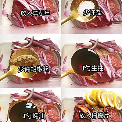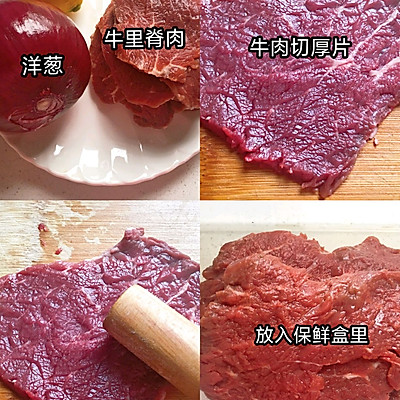 1、紫洋葱切丝,柠檬切片,牛里脊肉清洗干净切厚片,放到案板上敲打三分钟,把肉筋敲散,放到保鲜盒里。