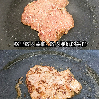 4、锅热放入黄油,放入腌制好的牛排,煎至一面定型翻面再煎2-3分钟即可!