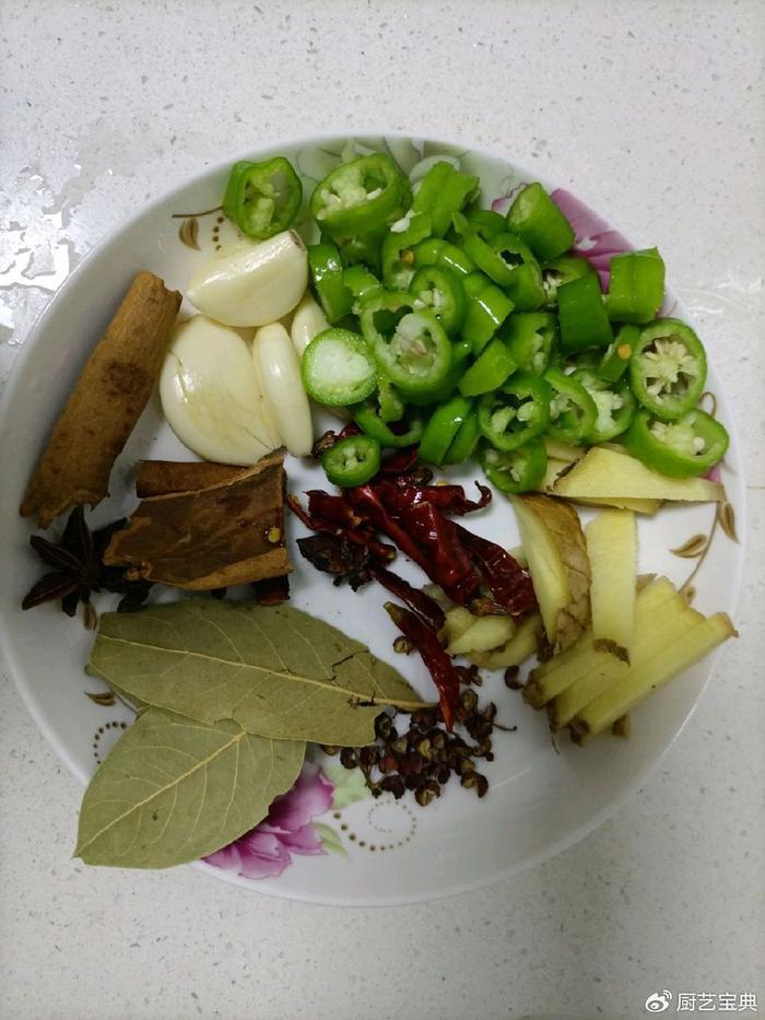 在准备过程中,我们搜罗了一系列香料:新鲜的姜片,香气四溢的干辣椒,八角的独特香味,桂皮的温暖气息,还有香叶、花椒和青辣椒,为这道红烧鸭子增添了多重风味。将姜切成细条,拍碎剥皮的蒜头备好,干辣椒切成小段,青辣椒则成了鲜艳的圈圈。