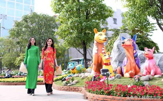 今年胡志明市2018年戊戌狗年春节花街以吉犬为装饰,所以花街到处布置着可爱的狗狗,但主要是越南本土的富国狗。越南模型怀灵儿和越南环球小姐柔贝伊在胡志明市阮惠花街漫步。