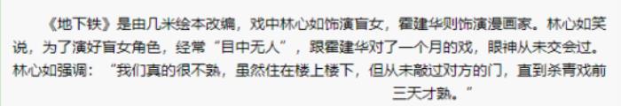 为了演好盲女角色,林心如笑称自己经常"目中无人",跟霍建华对了一个月的戏,眼神从来没有交会过,"我们真的很不熟,虽然住在楼上楼下,但从未敲过对方的门……"