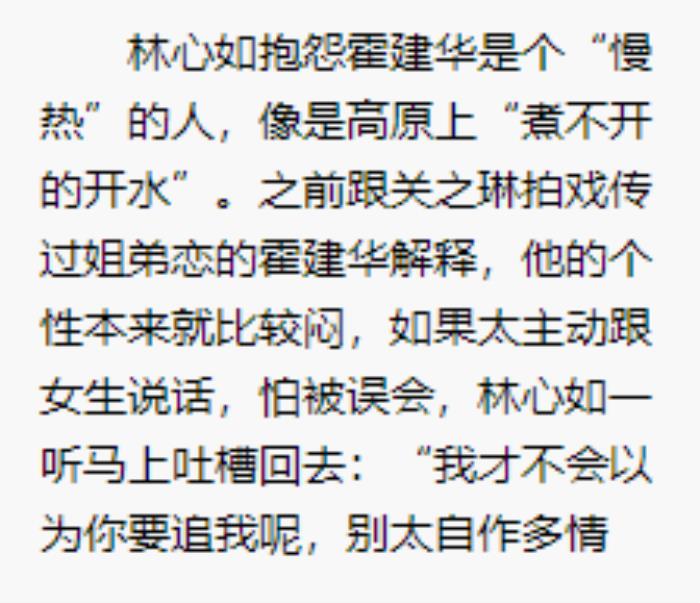 其实主要是霍建华在片场话很少,虽然林心如话多,喜欢聊天,但她一直找他聊天也很奇怪,于是打光或暂停拍摄时,两人就东张西望或各自拿着手机玩,"要不然对眼不说话就很尴尬啊。"