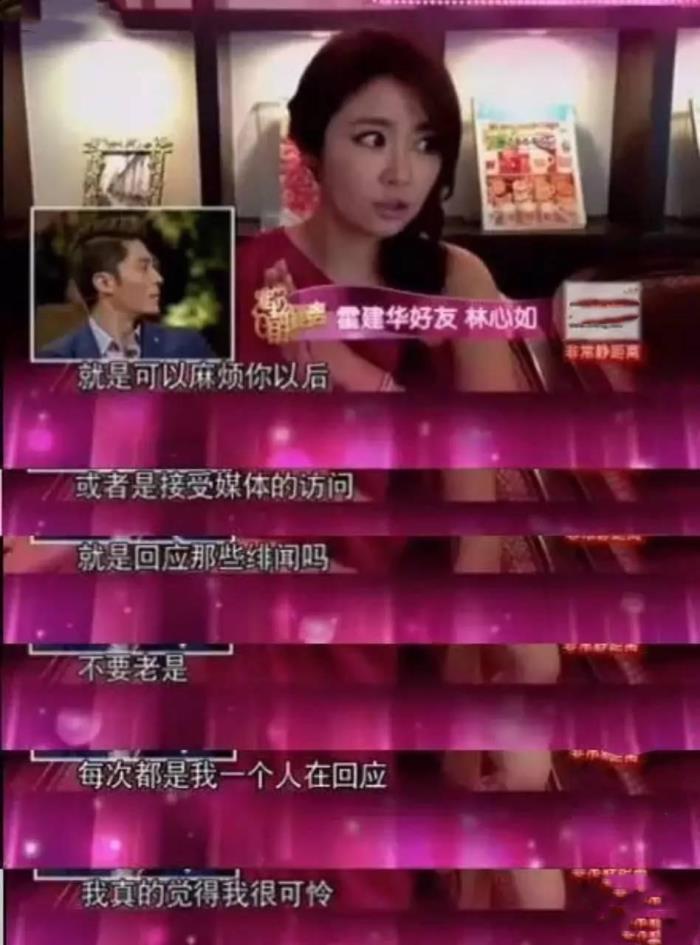 霍建华参加《非常静距离》时,林心如就以好友出境,在VCR中"控诉"霍建华,"每次都是我一个人在回应,我真的觉得我很可怜",希望如果以后再传绯闻,霍建华也去及时回应。