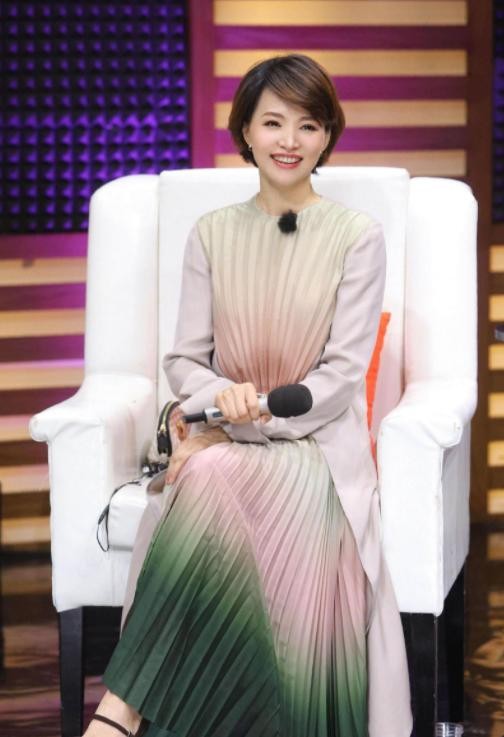 对于40岁往上走的女性来说,在平时穿衣搭配时,最好不要单纯的选择一个颜色,尤其是比较单调的灰、白、黑这些基础色。在这些基础色上来搭配一些明亮的颜色,不仅可以打破低调和平庸,还能使整体的时尚感被提升,而董卿的这条运用撞色晕染设计的百褶长裙,不仅打破了低调,还极具设计感。