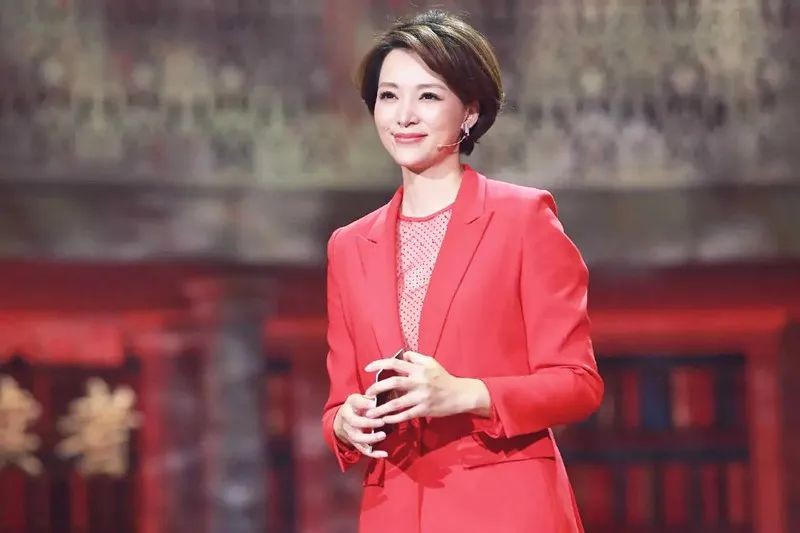 红色是一个充满热情似火的颜色,大面积的红色可以在视觉上让自己看起来精神饱满,红色还有修饰肤色的作用,尤其对于趋向中年的女性来说更友好。董卿的这套造型选择了红色的西装搭配波点的圆领内搭,波点内搭的优雅中和了西装的正式和干练感,搭配上精致的妆容,董卿看起来面色红润,十分有女人味。