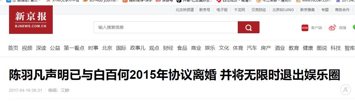 新京报-2017年4月16日-《陈羽凡声明已与白百何2015年协议离婚 并将无限时退出娱乐圈》