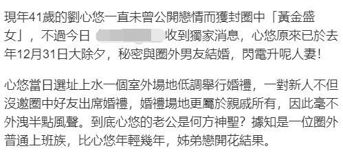 消息称,刘心悠的老公是一个普通上班族,比刘心悠小几岁,两人属于姐弟恋修成正果。
