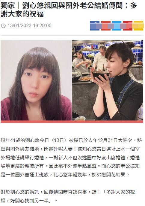 据港媒1月13日报道,41岁女星刘心悠去年12月31日秘密与圈外男友结婚,两人在一家室外场地低调举行婚礼,全程保密没有邀请圈中好友出席,只有亲属到场。