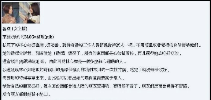 鲁豫也发文表示,私底下的林心如很直接,很友善,对待身边的工作人员都像对待家人一样,不用明星或者老板的身份使唤他们。