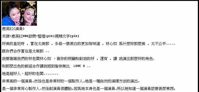 惠英红还发文称:我要谢谢我们的林老板林心如。谢谢你的照顾和对我的好,让我出演那么好的角色。和那么出色的剧组合作让我感到愉快无比。林心如是超好的人,超好的老板。林心如是个非常用心的制作人,然后对待演员很体贴。