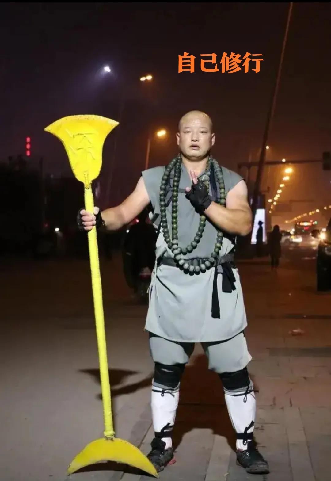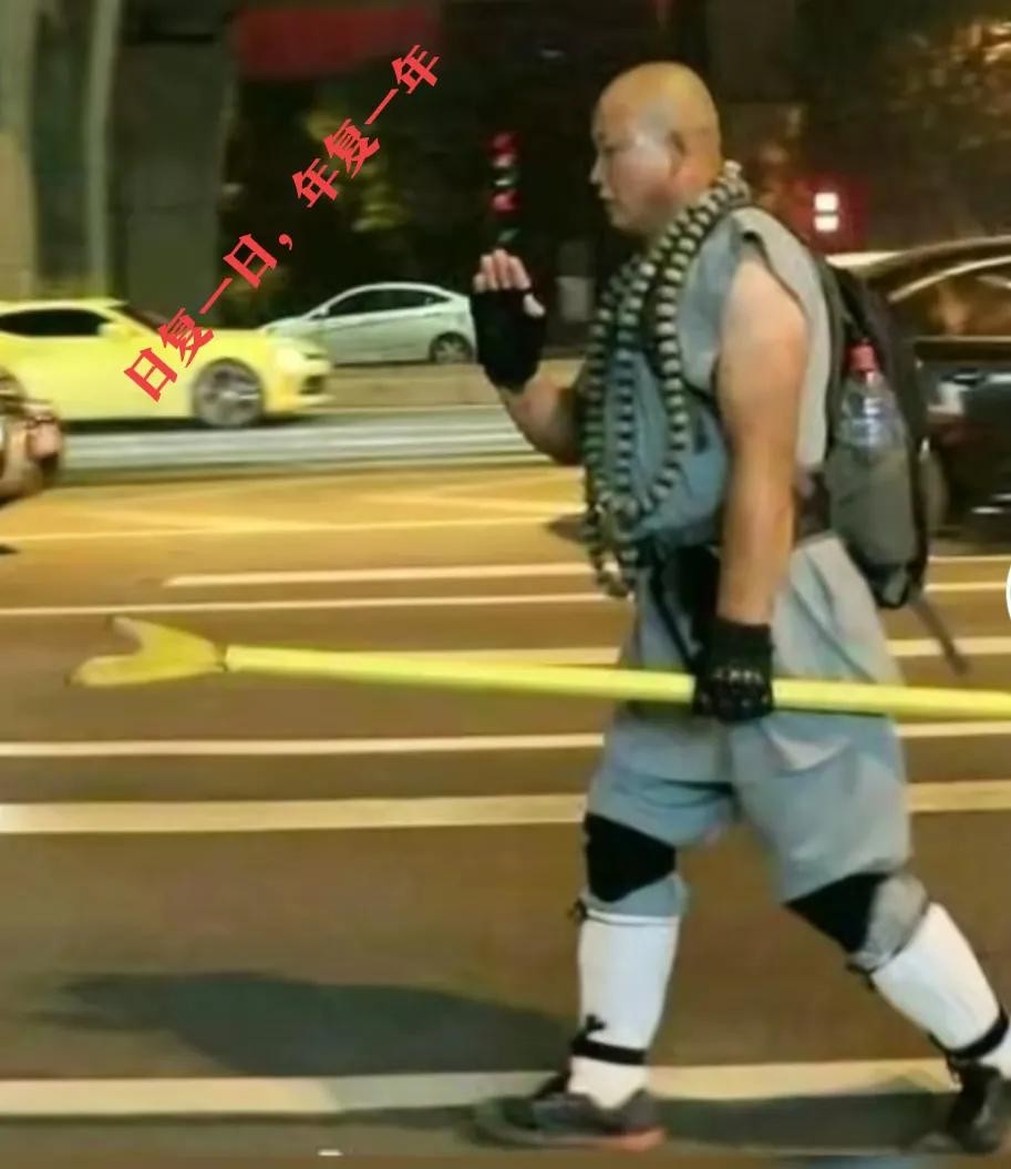 在山西太原街头,每天夜晚会看到一个身穿武僧服、手执月牙铲的光头小伙,他目不转睛,行色匆匆。