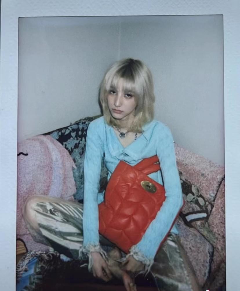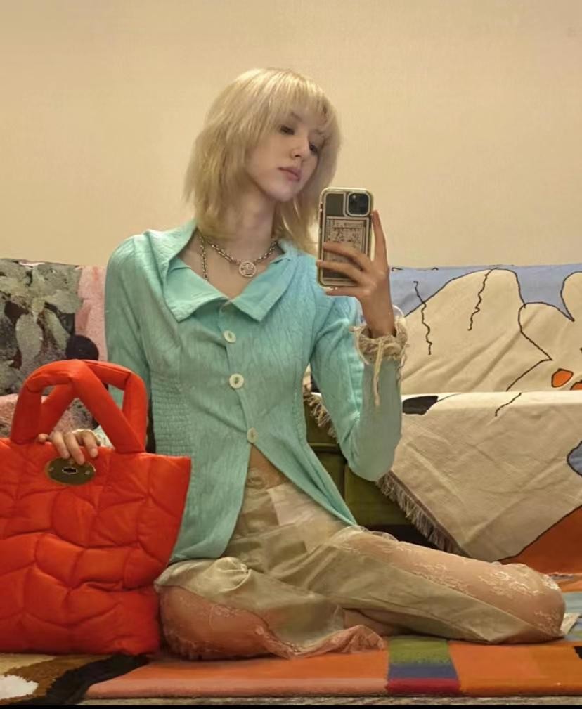 照片中的她穿着蓝色衬衫,提着红色包包,下身一条拼接白色蕾丝的裤子,整体打扮十分有个性。