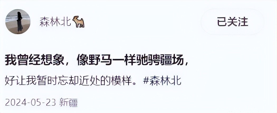 草原之上,一位女子身着米色长裙,英姿飒爽地策马奔腾,她的眼神坚定而锐利,仿佛能穿透天际的云层。这位女子不是别人,正是近日来备受关注的森林北。一个原本低调冷静的女性,却因一段感情的曝光,被推上了舆论的风口浪尖。