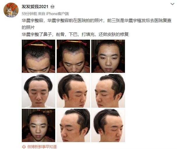 随后,她又晒出了华晨宇整容植发的全过程,据她描述,这些照片是在医院拍摄的,并且是她整容前的模样。