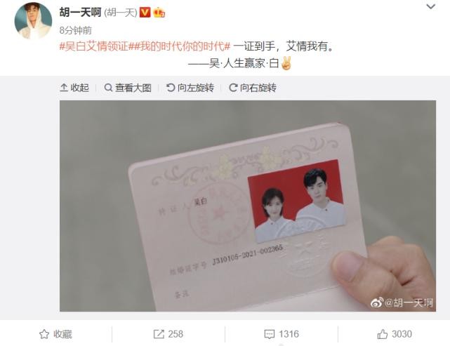 没错,目前还是热播中的电视剧《我的时代你的时代》可谓是进入到了十分重要的部分了。怂了那么多年,暗恋了“艾情”那么多年的“吴白”,这一次不仅是夺下了冠军,并且还和自己暗恋多年的女神“艾情”领证了。于是,身为“吴白”一角的饰演者,胡一天就忍不住,接连以“吴白”的身份,连更了2天微博炫耀了一波。
