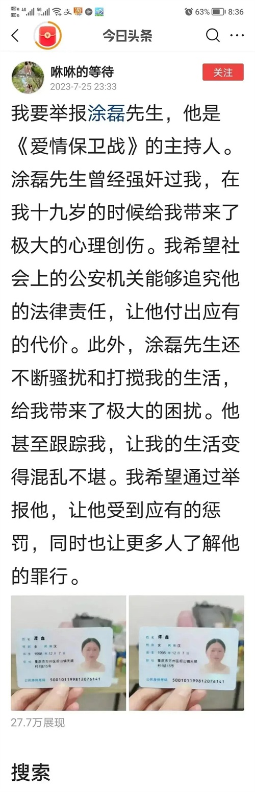 25岁女孩自述19岁被《爱情保卫战》主持人涂磊强奸