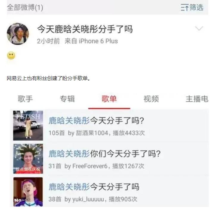 虽然有不少网友对这段恋情持祝福态度,认为两人多年的陪伴令人感动,但也有不少人盼望着他们分手,甚至在微博和网易云歌单上打卡记录“分手传言”。