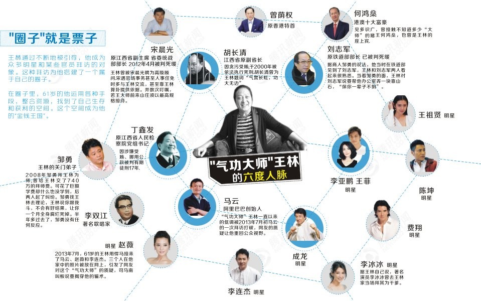 王林作为“气功学会”的重要成员之一,凭借高超的“气功”迅速火遍全国,和一线明星、知名企业家、国外首脑高官等有着密切往来。