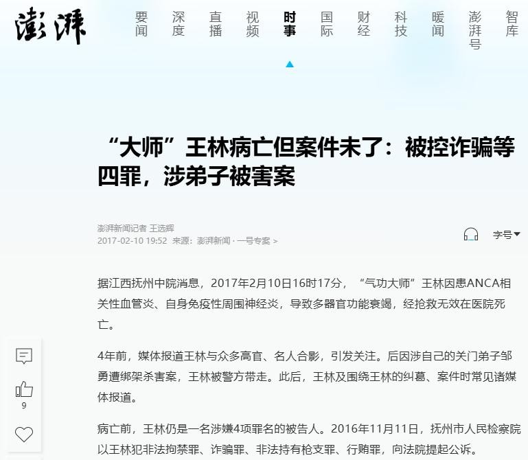澎湃新闻2017年2月10日,“大师”王林病亡但案件未了:被控诈骗等四罪,涉弟子被害案