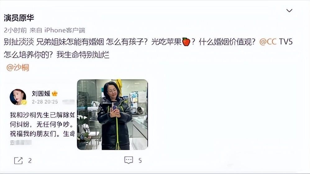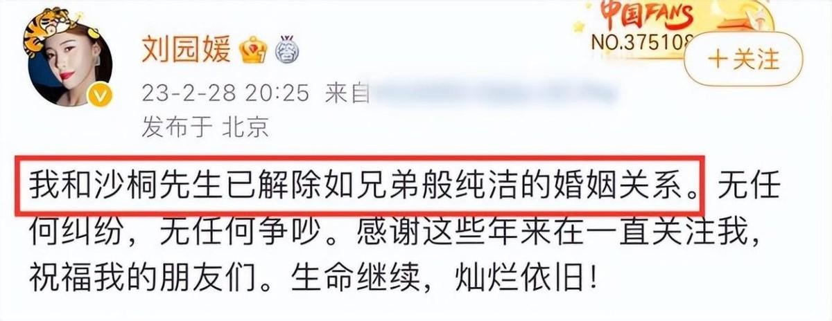 演员刘园媛发文:我和沙桐先生已解除如兄弟般纯洁的婚姻关系。