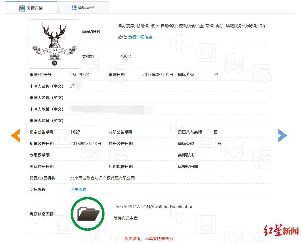红星新闻查阅中国商标网发现,以“鹿角巷”中文字、图案、英文字母等单独或组合元素申请的商标多达400多个,其中有的文字、图案与本案中的涉案标识相似,有的字体则完全不同。以邱先生为申请人的“鹿角巷”相关申请商标约80多个,横跨几十个商标类别。这当中最早申请的商标名称为“鹿角巷 THE ALLEY DA”,图案为鹿头、中文字、英文字母等元素组合,申请日期为2017年8月1日,商标状态为“等待实质审查”。