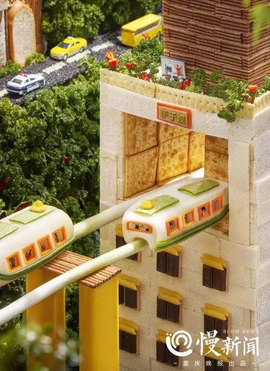 90后摄影师马猴君发挥创意,用威化饼干等食材搭建了李子坝站,作为重庆地标的代表。