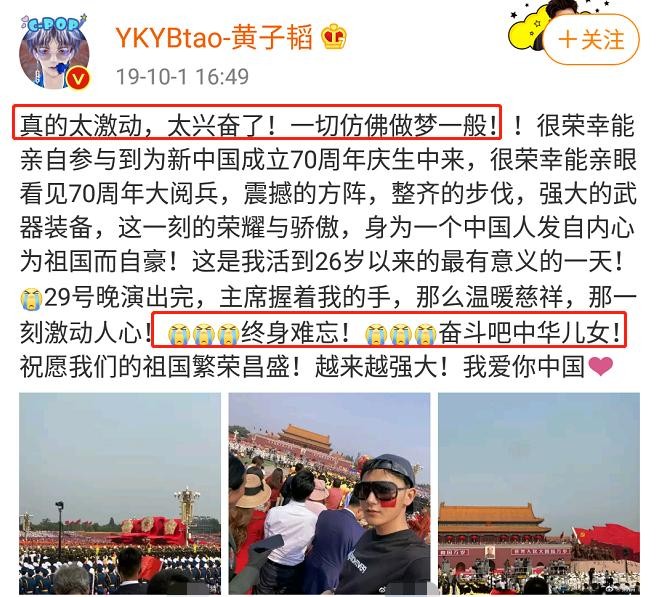 每个人都有每个人自己的看法,不过大部分人眼里黄子韬其实一直是这样直接的人,就像70周年阅兵那天,亲眼看完后他兴奋地发文分享,像大家身边的每一个人。