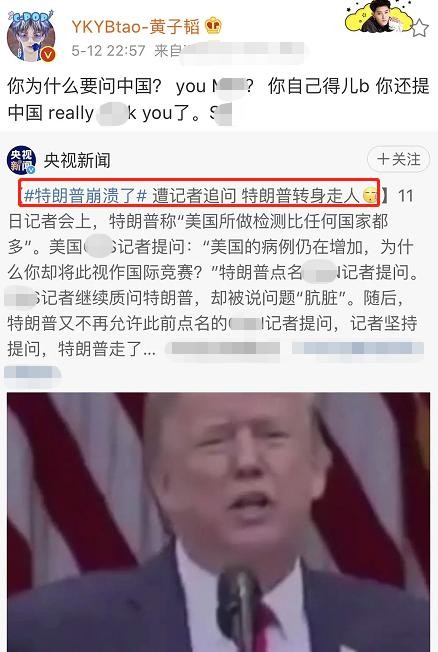 5月12号深夜,黄子韬突然用自己的账号转发央视新闻的一条动态,原内容是个小视频,美国总统特朗普在记者会上被追问崩溃,直接转身走人。因为其中提到了中国,黄子韬就质问“你为什么要问中国”,言辞激烈怒怼特朗普,中文英文混骂。
