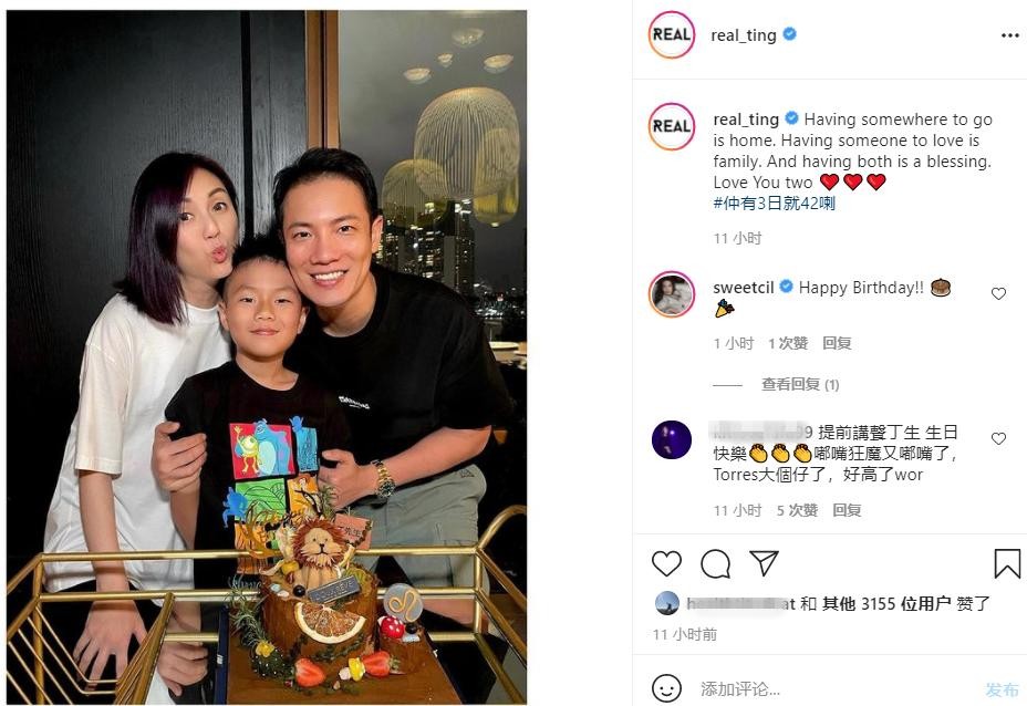 曝光的照片中,丁子高迎来42岁生日,妻子杨千嬅和9岁儿子Torres聚在一块为他庆祝,一家三口同框,画面温馨。