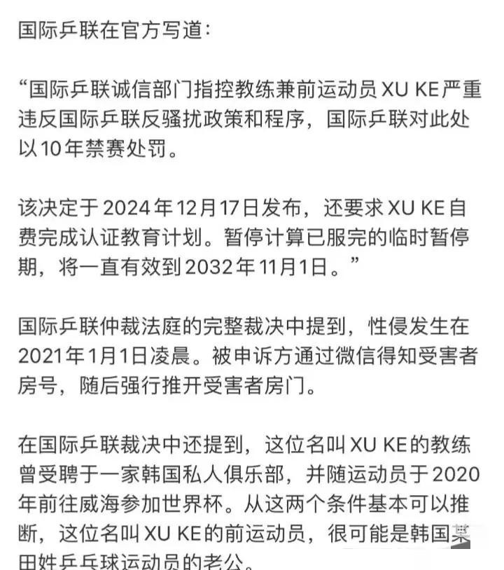 可田志希的老公,却实在一言难尽。之前国际乒联就发布了一则消息,指出有个教练兼前运动员XU KE严重违反了国际乒联的反骚扰政策,对此对徐克进行了10年的禁赛处罚。