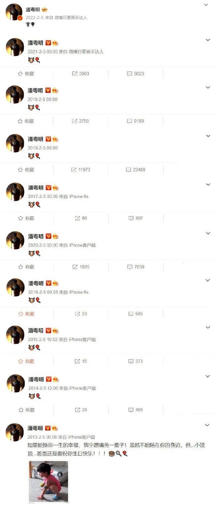 潘粤明掐点发微博为儿子顶顶庆祝生日,相比于往年落寞又无言的祝福,这次显然高调很多。