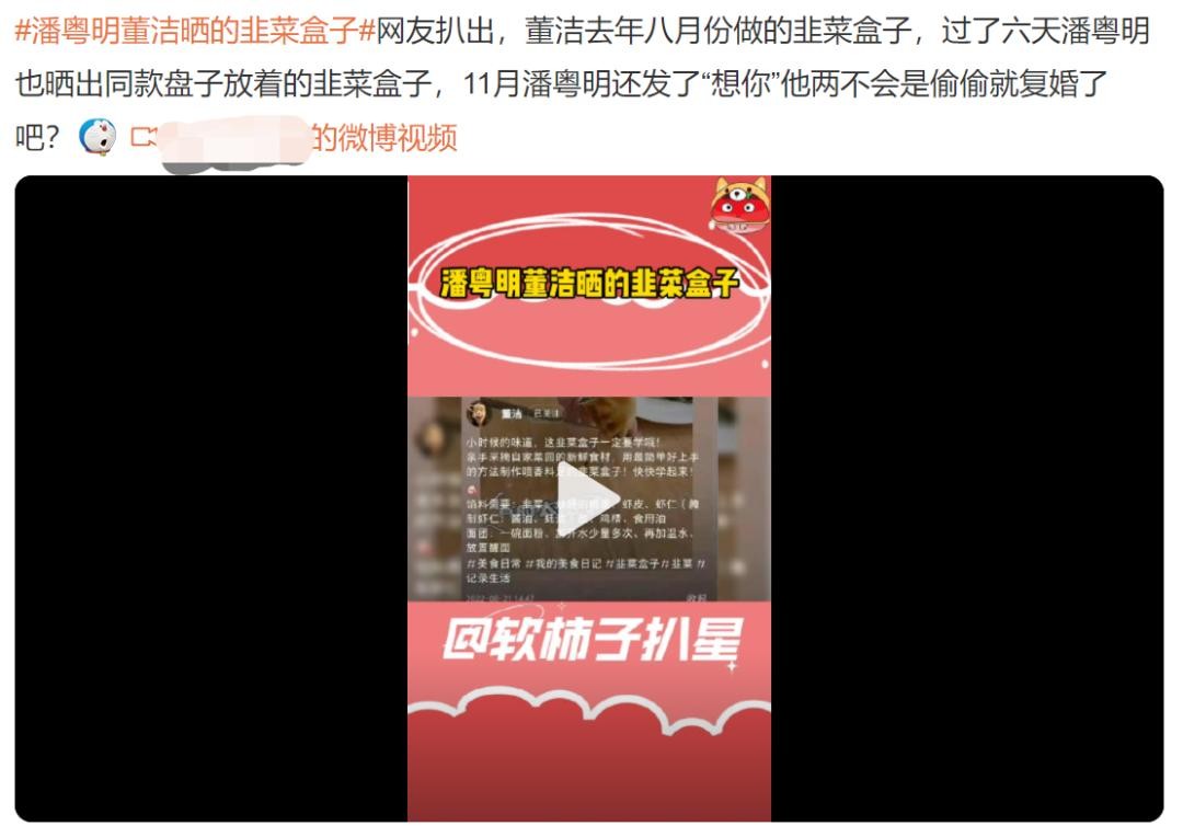 2月7日,有网友披露潘粤明和董洁晒出同款“韭菜盒子”,两人似乎已经复合。