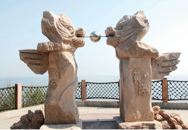 田横山是黄渤海分界线上的另一个著名景点。一提到田横山很多人想到的都是田横与五百壮士的壮举。除此之外,田横山还有一个很重要的身份,那就是黄渤海的分界坐标。设计师们别出心裁地在田横山上设计了一个二龙戏珠的地标。地标上两条盘曲而上的巨龙,象征黄海与渤海;二龙所戏的一珠代表的是蓬莱。这既呈现了华夏图腾艺术的美感,也成为田横山的名片。田横山上的栈道沿山而起,可以使游客获得“脚踏万顷碧涛,头顶危岩绝壁”的观景体验,也给观赏黄渤海分界线提供了别样的感受。
