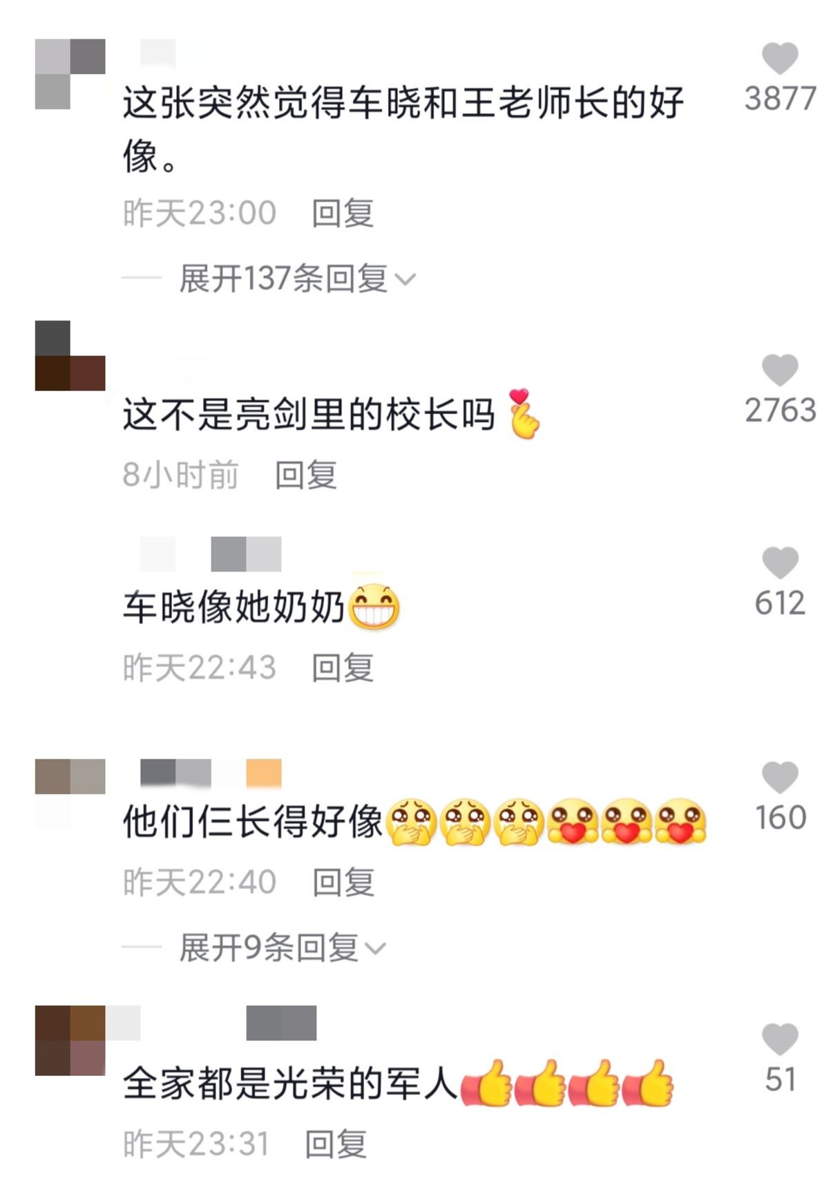 网友看了王丽云晒出的图片,有人留言表示觉得车晓和王老师长得好像,有人觉得车晓更像他的奶奶,祖孙三代都非常像。还有网友认出程晓的父亲,曾经在经典剧集《亮剑》中出演过校长一角。