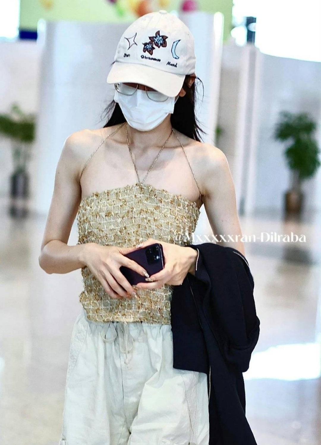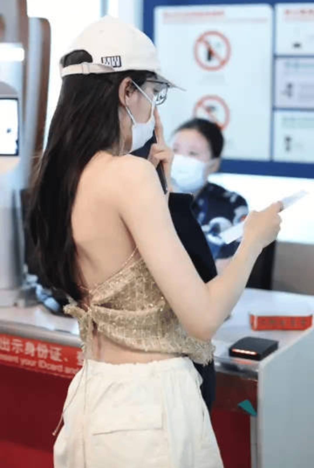 当然,火热的不只是围堵机场的粉丝,还有天气,炎炎夏日,迪丽热巴也适时地穿了一件特别漂亮的金色吊带上衣,紧身的裁剪设计凸显迪丽热巴的好身材,极细的吊带更是显得性感。