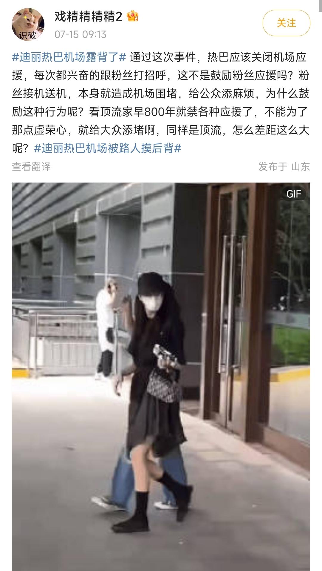 7月15日,一段女明星迪丽热巴在机场被骚扰的视频登上热搜,有陌生人当众抚摸了迪丽热巴裸露的后背,引发了网友的热议。