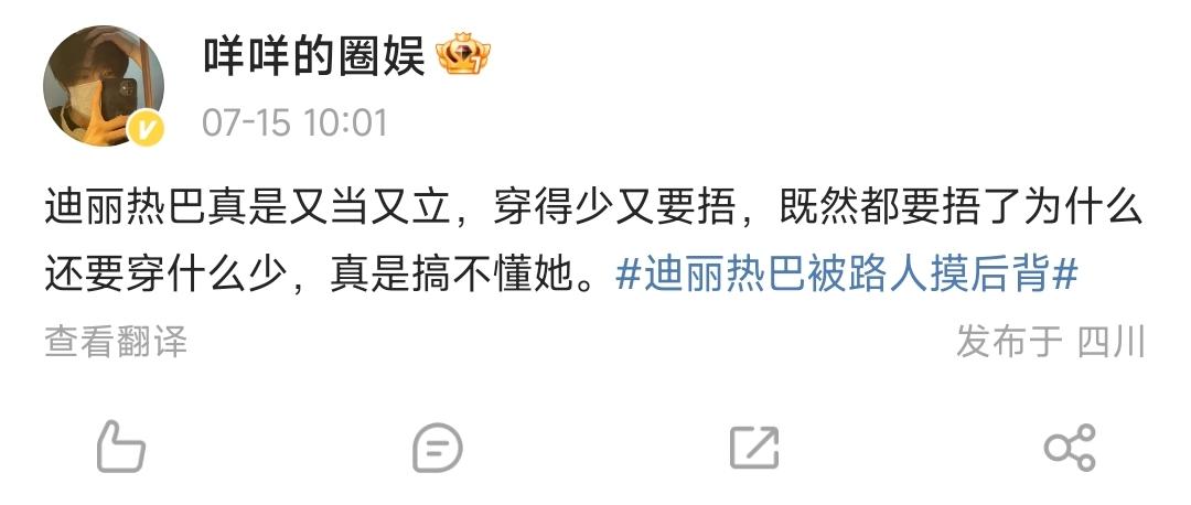 评论区里不少迪丽热巴的粉丝已经炸毛,觉得公共场合没经过迪丽热巴的允许就偷偷抚摸她的后背,这是明星的猥琐行为,别说是对明星,就是对普通姑娘,你在街上摸人家露出的皮肤就是典型的“咸猪手”。