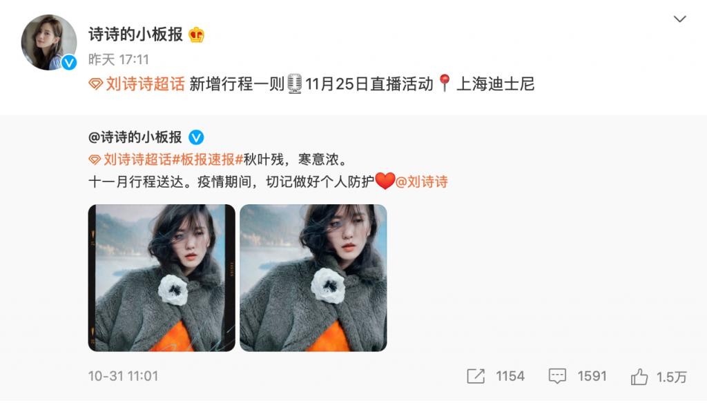 还有去年 11 月刘诗诗发布的工作行程里只有一天有工作安排,也被粉丝撕上天,最后硬是多加了一场上海迪士尼的直播。