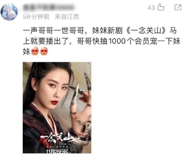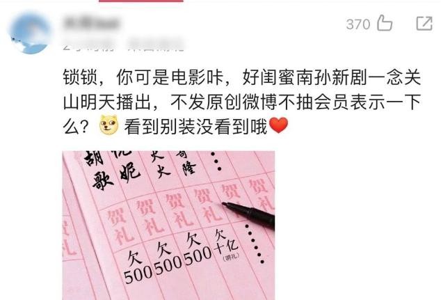 于是,粉丝也跑去倪妮的微博评论区去要宣传了,话术是 " 好闺蜜南孙新剧一念关山明天播出,不发原创微博不抽会员表示一下么?"