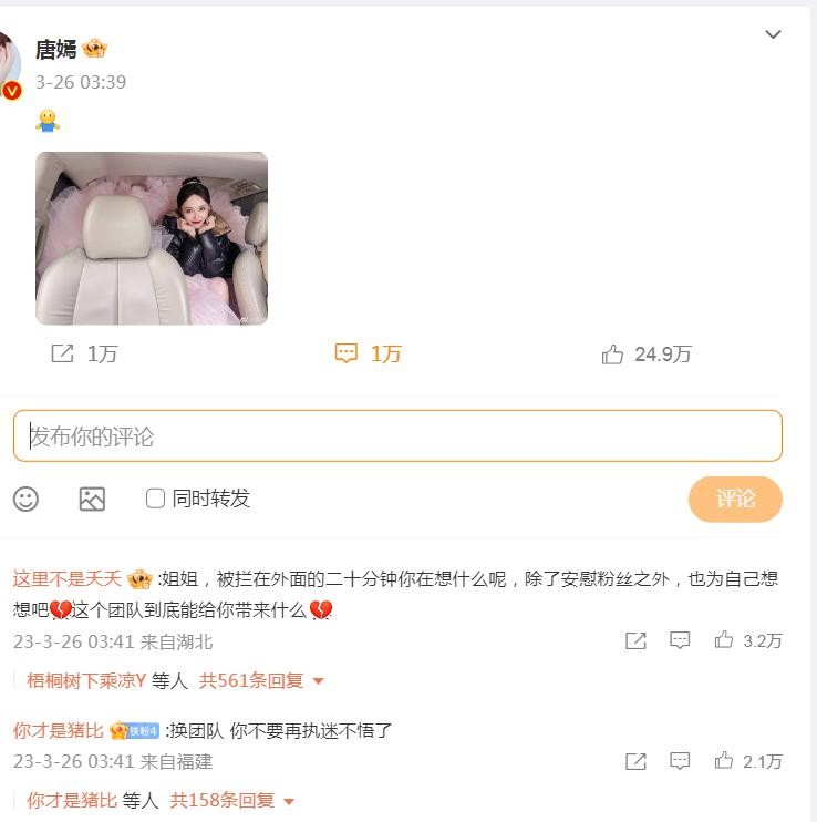 唐嫣婚后也挺佛系,粉丝也没什么大动静,直到搞出上次微博之夜唐嫣进不去会场这种超级大乌龙粉丝才一怒之下怒了一下。