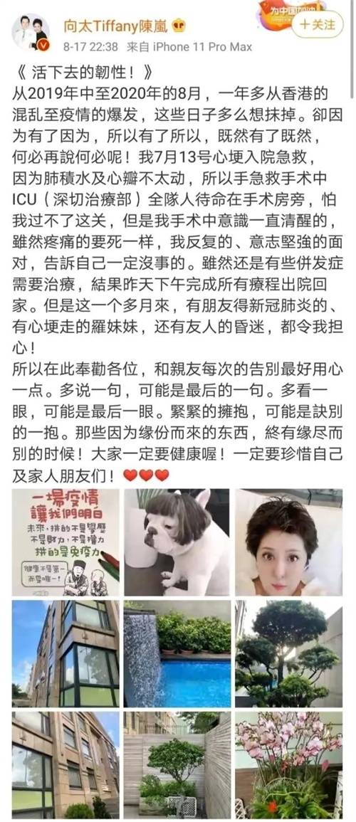 出院后,陈岚第一时间报平安,用自己的经历告诉大家一定要保护好身体,珍惜身边的亲朋好友。