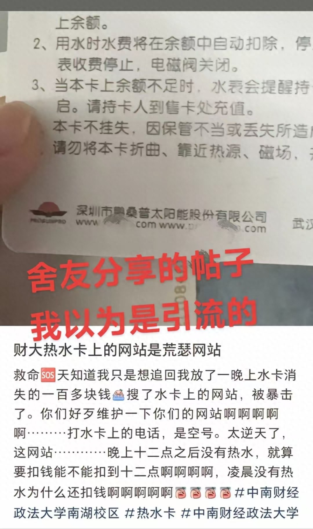 10月22日,据一中南财经政法大学学生发帖吐槽称,其在使用该校热水卡时,发现卡上所提供的网址链接打开后竟是色情网站,“没想到打开之后发现视频真的能播放”,且尝试拨打热水卡上预留的联系电话,却显示为空号,这一情况迅速在网络上发酵,引发了公众的强烈关注与质疑。
