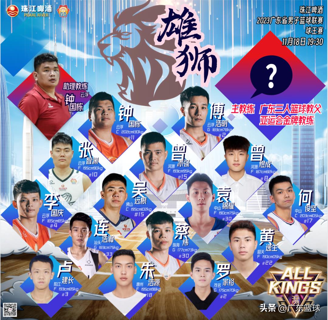 雄狮队阵容则以联赛第二、三、四名的云浮、河源、中山集合力量,联赛总得分王傅浩明、爆破张智渊等多名攻击力强的球员, 三分射手袁锦耀、曾煜成、加上佛山中流砥柱吴远根、珠海节奏大师蔡炜等火力球员。