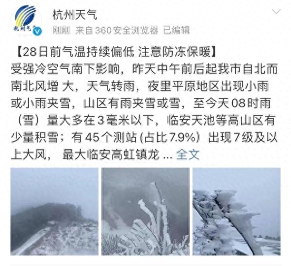 杭州市气象台最新发布消息:28日前气温持续偏低注意防冻保暖。
