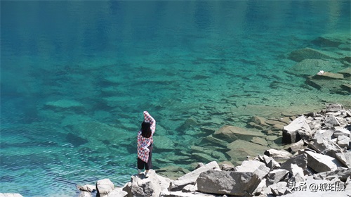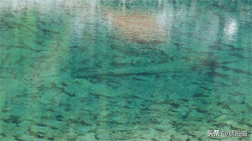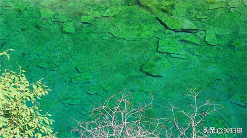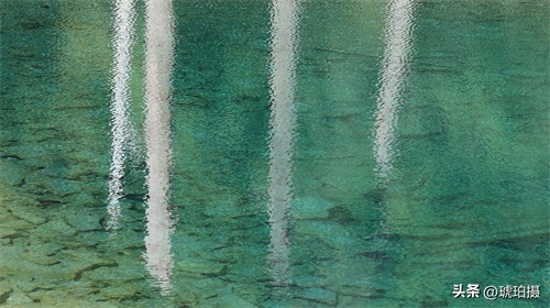 五彩池的水很浅,但水质透明清澈。与长海的宽大相比,她就像不出闺房的小家碧玉。因池水很浅,周围裸露出的都是灰白一圈乱石,山势又特别高大,所以拍不出青山环抱的大气场。如果单独拍湖一周,效果就是一个一洼蓝绿色的水坑。所以我就接近了镜头,只拍水中的倒影与池中的石头,以及附着的生物,晕染出一幅幅油画色彩。